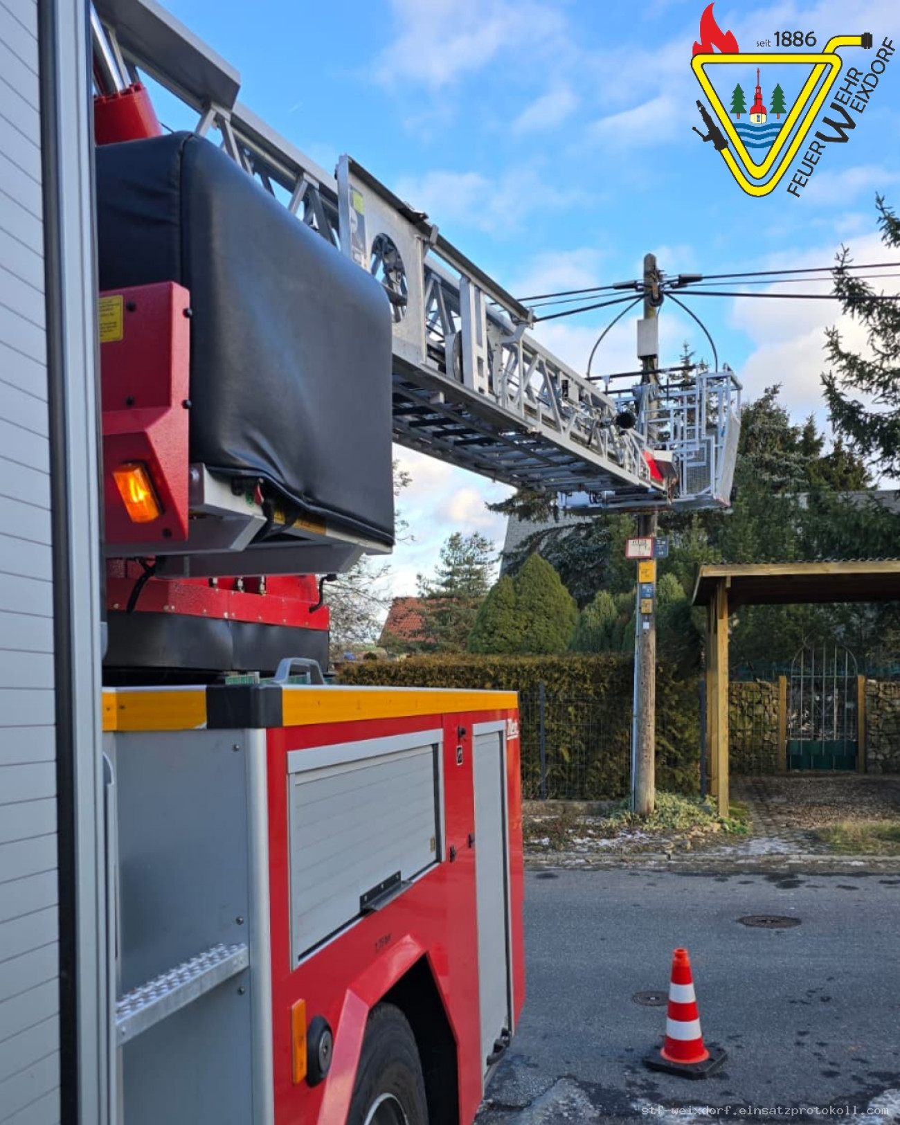 Ein Telekommunikationsmast schwankte witterungsbedingt und drohte auf eine Straße zu stürzen. Wir sicherten den Mast mittels Drehleiter, bis das zuständige Unternehmen eintraf. Unser Einsatz dauerte 5,5 Stunden.